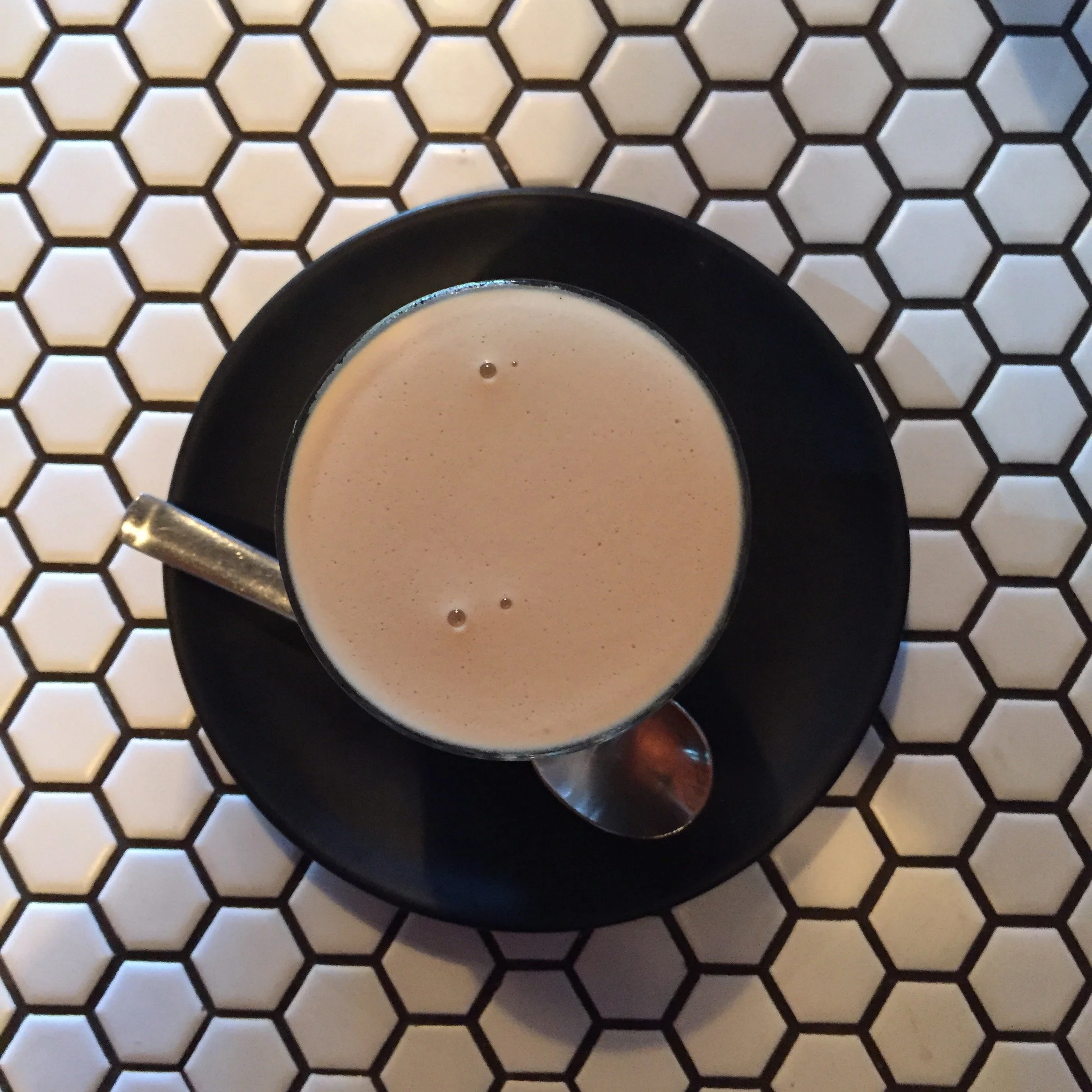 Cup of coffee with foam on a black saucer, on a hexagonal tiled surface.